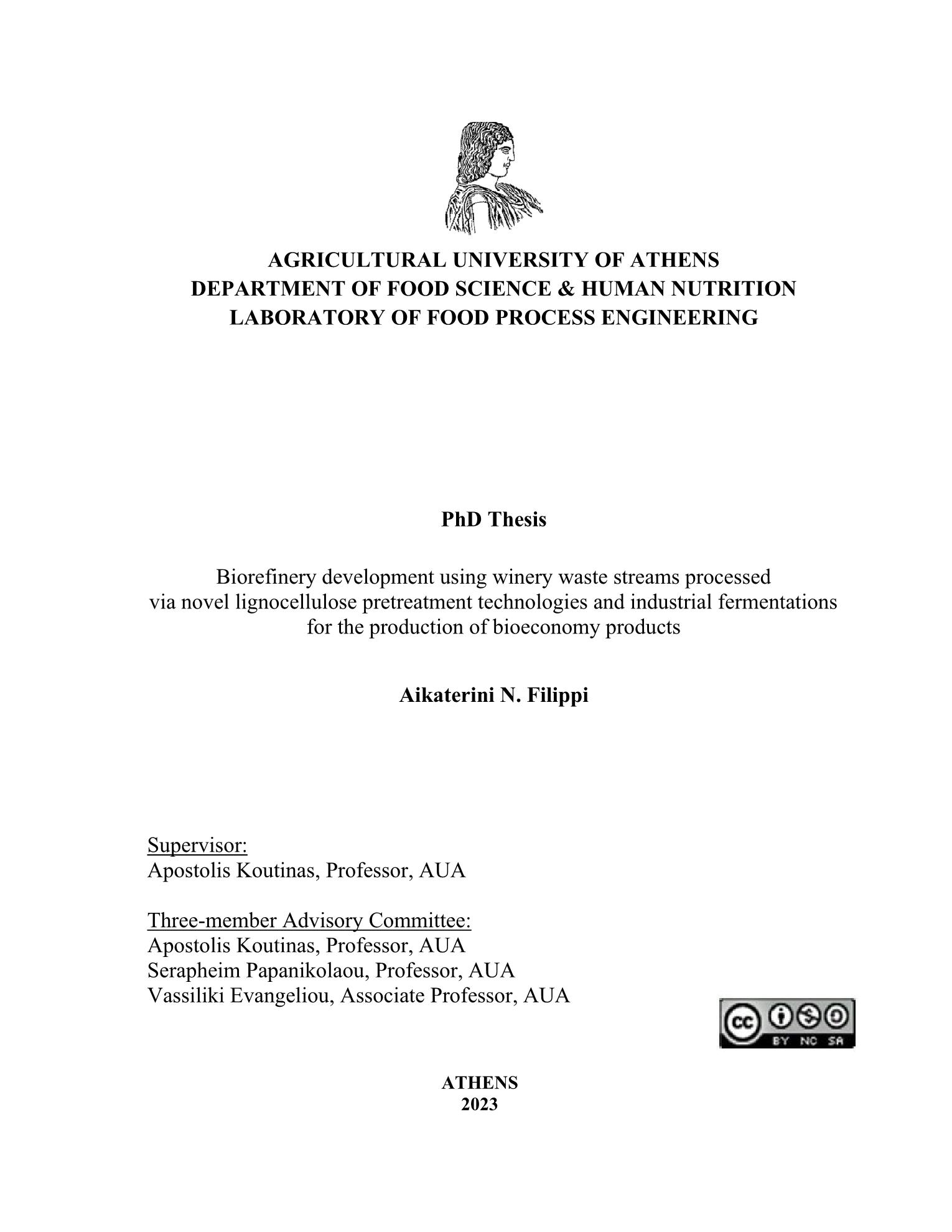 The scope of this thesis is to investigate the development of an integrated and multifunctional biorefinery, utilising by-product streams generated from the winemaking process (grape pomace, stalks and wine lees) for the sustainable production of value-added products and chemicals using novel technologies for the pretreatment of lignocellulosic biomass. The study was initiated with the compositional analysis of grape pomace and stalks generated after the wine making process of Agiorgitiko variety. Grape pomaces were initially processed for water extraction of free sugars followed by phenolic and lipid extraction with ethanol and hexane, respectively. The remaining solids were mixed with grape stalks (1:1 ratio) and treated with 1% (w/v) sodium hydroxide at 100°C for 3 h for lignin removal. The residual solids were hydrolysed with varying H2SO4 concentrations (3, 5, 7%, v/v) at 100°C for 40 min for hemicellulose hydrolysis. The remaining solids were subjected to enzymatic hydrolysis usi ...