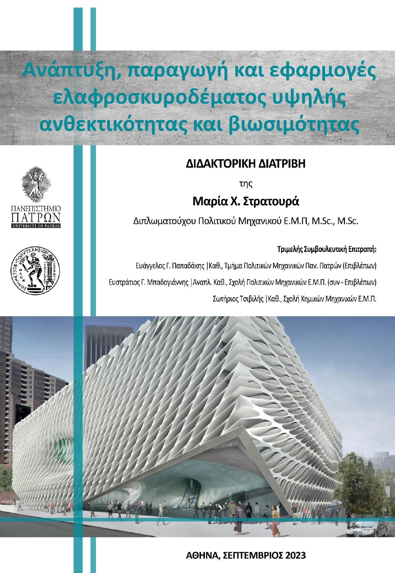 Η παρούσα διδακτορική διατριβή εστιάζει στη θεωρητική ανάλυση και πειραματική μελέτη του ελαφροσκυροδέματος με τη χρήση βιομηχανικών παραπροϊόντων, ενός τεχνολογικά προηγμένου υλικού που αναμένεται να έχει σημαντικά οφέλη στον τομέα της κυκλικής οικονομίας και να συμβάλει στην περαιτέρω ανάπτυξη της βιομηχανίας ετοίμου σκυροδέματος. Ο βασικός στόχος της διατριβής είναι ο σχεδιασμός και η παρασκευή βέλτιστων μειγμάτων ελαφροσκυροδέματος με επιθυμητές φυσικοχημικές και μηχανικές ιδιότητες. Αρχικά πραγματοποιείται μια διερεύνηση της ποζολανικότητας των πρώτων υλών που χρησιμοποιήθηκαν. Στην συνέχεια, ακολουθεί προκαταρκτική μελέτη και εκτίμηση της μικροδομής του ελαφροκονιάματος με κίσσηρη. Στη μελέτη αυτή, δίνεται έμφαση στην εξέταση του πώς η προσθήκη τσιμεντοειδών πρόσθετων (μετακαολινή, ιπτάμενη τέφρα, πυριτική παιπάλη, σκωρία υψικαμίνου) σε ποσοστά 10% και 20% του τσιμέντου επηρεάζει την ανθεκτικότητα του σκυροδέματος. Aκολουθεί εκτενής διερεύνηση της επίδρασης των χαρακτηριστικών των συνθέσεων ελαφροσκυροδέματος σε θέματα ανθεκτικότητας. Συγκεκριμένα, τα θέματα ανθεκτικότητας που εξετάζονται περιλαμβάνουν: α) τη διαπερατότητα σε νερό μέσω του υπολογισμού του ανοικτού πορώδους και του συντελεστή τριχοειδούς απορρόφησης, β) τη διαπερατότητα σε χλωριόντα μέσω του υπολογισμού του συντελεστή διείσδυσης χλωριόντων μη σταθερής κατάστασης, του συντελεστή διείσδυσης (Chloride migration test) και τον προσδιορισμό του συντελεστή διάχυσης χλωριόντων, γ) το βάθος ενανθράκωσης ενώ τελικά αξιολογείται η ανθεκτικότητα μετά από συνεχείς κύκλους ψύξης-απόψυξης. Ακολούθως, πραγματοποιείται εκτενής ανάλυση της επίδρασης των μηχανικών ιδιοτήτων του ινοπλισμένου ελαφροσκυροδέματος. Εξετάζονται δοκιμές μονοαξονικής θλίψης και κάμψης τριών σημείων σε δείγματα σκυροδέματος που ελήφθησαν από κάθε εξεταζόμενη σύνθεση σκυροδέματος. Συγκεκριμένα, εξετάζονται τρεις διαφορετικές συνθέσεις του μείγματος PePu, με διαφορετικά ποσοστά ινών (Vf=0.25% και Vf=0.50%). Στο τέλος της μελέτης, πραγματοποιείται έλεγχος της δομοστατικής επάρκειας πρισματικών δοκών οπλισμένου σκυροδέματος, μέσω της κάμψης τεσσάρων σημείων και γίνεται αναλυτική παρουσίαση και σχολιασμός των πειραματικών αποτελεσμάτων. Τα αποτελέσματα της παρούσας διατριβής δείχνουν ότι, η παραγωγή ελαφροσκυροδέματος με βιομηχανικά παραπροϊόντα ανοίγει νέες δυνατότητες στον τομέα της κατασκευής. Αυτή η προηγμένη πρακτική συνδυάζει βιώσιμες προσεγγίσεις με τεχνολογικές καινοτομίες, αντιμετωπίζοντας αποτελεσματικά τις προκλήσεις των εκπομπών CO2, της ενεργειακής απόδοσης και της παραγωγής αποβλήτων. Πέρα από τα περιβαλλοντικά οφέλη, το ελαφροσκυρόδεμα επιδεικνύει εξαιρετική δομική συμπεριφορά και ανθεκτικότητα, που το καθιστούν ιδανικό για ποικίλες εφαρμογές, από κτίρια μέχρι έργα υποδομής. Η χρήση ελαφροσκυροδέματος επιτρέπει στους αρχιτέκτονες και μηχανικούς να επιτύχουν τους σχεδιαστικούς τους στόχους, προσαρμοσμένους σε περιβαλλοντικά κριτήρια και νομοθετικές απαιτήσεις. Εν τέλει, το ελαφροσκυρόδεμα αναδεικνύεται ως καινοτόμα επιλογή που συνδυάζει αντοχή και αισθητική, παρέχοντας ευκαιρίες για βιώσιμη και αποδοτική κατασκευή.