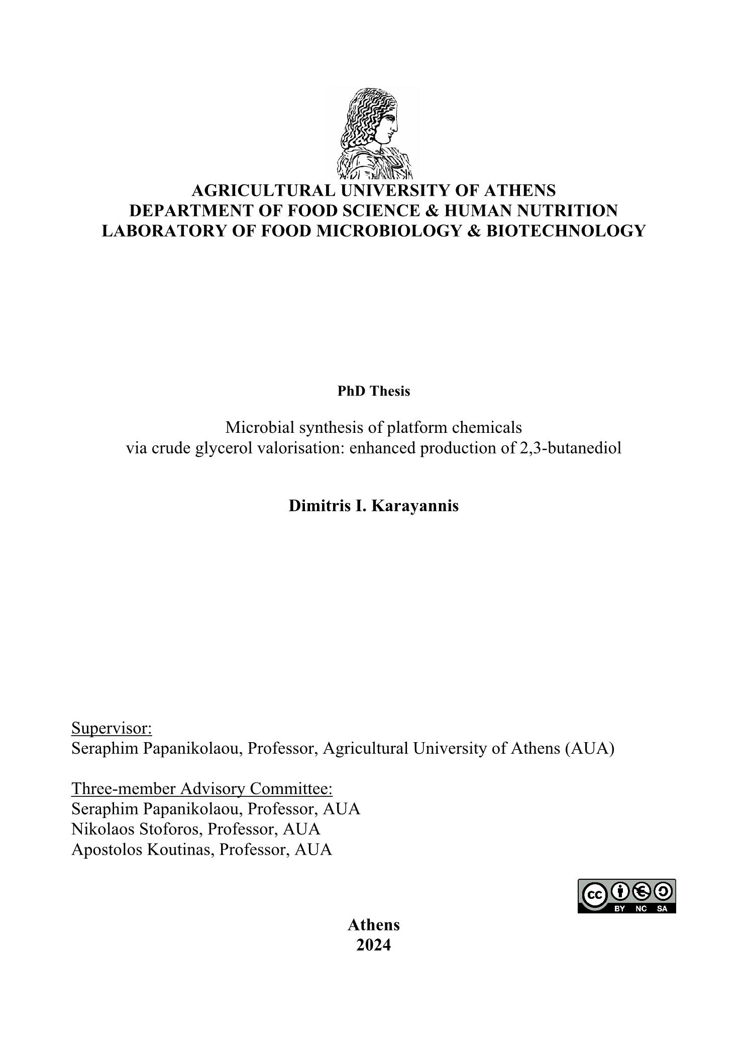 Η ανθρωπότητα βρίσκεται στα πρόθυρα της μετάβασης από την βασισμένη στα ορυκτά καύσιμα οικονομία σε αυτή της βιοοικονομίας. Η ανάπτυξη πετροχημικών υποκατάστατων στο πλαίσιο βιώσιμων βιοδιεργασιών έχει προσελκύσει μεγάλο ενδιαφέρον τόσο από την ακαδημία όσο και από τη βιομηχανία. Το βιολογικό πετρέλαιο (βιοντίζελ), το οποίο είναι ένα υποκατάστατο πετροχημικών καυσίμων, παρουσίαση ραγδαία ανάπτυξη τις 3 τελευταίες δεκαετίες. Η παραγωγή του βιοντίζελ συνεπάγεται την ταυτόχρονη παραγωγή γλεκερόλης (Γλυκ), ως το κύριο παραπροϊόν της διεργασίας, καθώς ~1 kg αυτής παράγεται για κάθε ~9 kg βιοντίζελ. Εκτιμάται ότι το ~65% της παγκόσμια παραγωγής γλυκερόλης προέρχεται από την παραγωγή βιοντίζελ, με αποτέλεσμα την υπεραφθονία αυτής στην παγκόσμια αγορά. Η αξιοποίηση της γλυκερόλης μέσω μικροβιακών ή/και χημικών μετατροπών παρουσιάζει έντονο οικονομικό και περιβαλλοντικό ενδιαφέρον. Η χρήση της γλυκερόλης, προερχόμενης από το βιοντίζελ, ως υλικό εκκίνησης για μικροβιακές καλλιέργειες με σκοπό τη ...