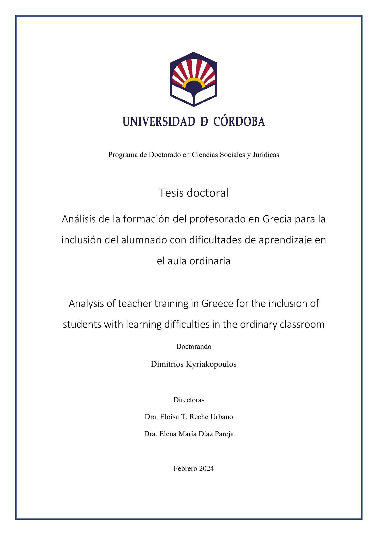 This study deepens the training of primary school teachers in Greece and to what extent the inclusion of students with learning difficulties is affected by it. The current framework of training programs is examined by the research as well as the degree of implementation and success of inclusive education in the Greek primary education system. The main purpose of this study has been to analyze in depth the training received by teachers on the inclusion of students with learning difficulties in the ordinary classroom. Four specific objectives were set in order to develop and achieve the above main purpose. It was crucial to describe the real situation of Greek primary teachers in the face of educational inclusion. For this reason, the development of an instrument was proposed that would allow us to know the training needs in the field of educational inclusion and discover in which areas these needs are most urgent for teachers. Finally, it has been considered very important to propose a plan to improve teacher training as a satisfactory response to the problems detected. The theoretical framework consists of three chapters. The first chapter includes the approaches to inclusive education, its terms, its benefits, and how it evolves all over the world. The strategies followed in Greece for the development of inclusive education are also presented in this chapter. The second chapter focuses on learning difficulties and the educational needs that arise. The third chapter discusses the subject of teacher training in general. It deals more specifically with what was traditionally called Special Education and learning difficulties. First, an international panorama is given and then focuses on the Greek sphere. Regarding the methodology of this study, the mixed approach was applied, which encompasses both quantitative and qualitative techniques. Specifically, an ad hoc questionnaire with four dimensions and 44 items has been designed for quantitative data collection, while interviews were conducted for qualitative data gathering. The sample of the quantitative research consisted of 205 primary school teachers who completed the designed questionnaire. Once the data were collected, they were processed and analyzed using: descriptive analysis, exploratory factor analysis, inferential analysis, post hoc tests, and correlations of paired samples. The sample of the qualitative research consisted of primary school principals and teachers who conducted semi-structured interviews in which they delved into their opinions and experiences regarding the research topic. The findings indicated that most of the participants lack any form of training in learning difficulties. It is worth noting that a significant percentage of the educators currently employed are substitute teachers. A significant finding has emerged from the study, indicating that a majority of the participants recognize the significance of training in addressing learning difficulties. They firmly believe that the absence of proper training significantly hampers the inclusion of students with learning difficulties. Equally important is that the majority of participants consider that the training affects their attitudes. Teachers disagree with the strategy followed by the Ministry of Education in matters of inclusion and attention to diversity. The results also revealed that the school infrastructure and the curriculum, are not suitable for the inclusion of students with learning difficulties. Finally, it has been discovered that Greek teachers do not believe they have enough training in learning difficulties. This is mainly due to constraints such as limited time availability, the financial burden associated with training, and the scarcity of regular training activities in this field. In conclusion, the Ministry of Education must change its strategy regarding inclusive education, properly informing the educational staff by offering many opportunities for training in learning difficulties with a specific program. At the same time, the will of teachers to be trained is important in itself, but having the appropriate school infrastructure, curriculum and equipment. For this reason, the present study, in chapter six, proposes and presents a comprehensive training program that can be used by competent bodies so that inclusion is crowned with success.