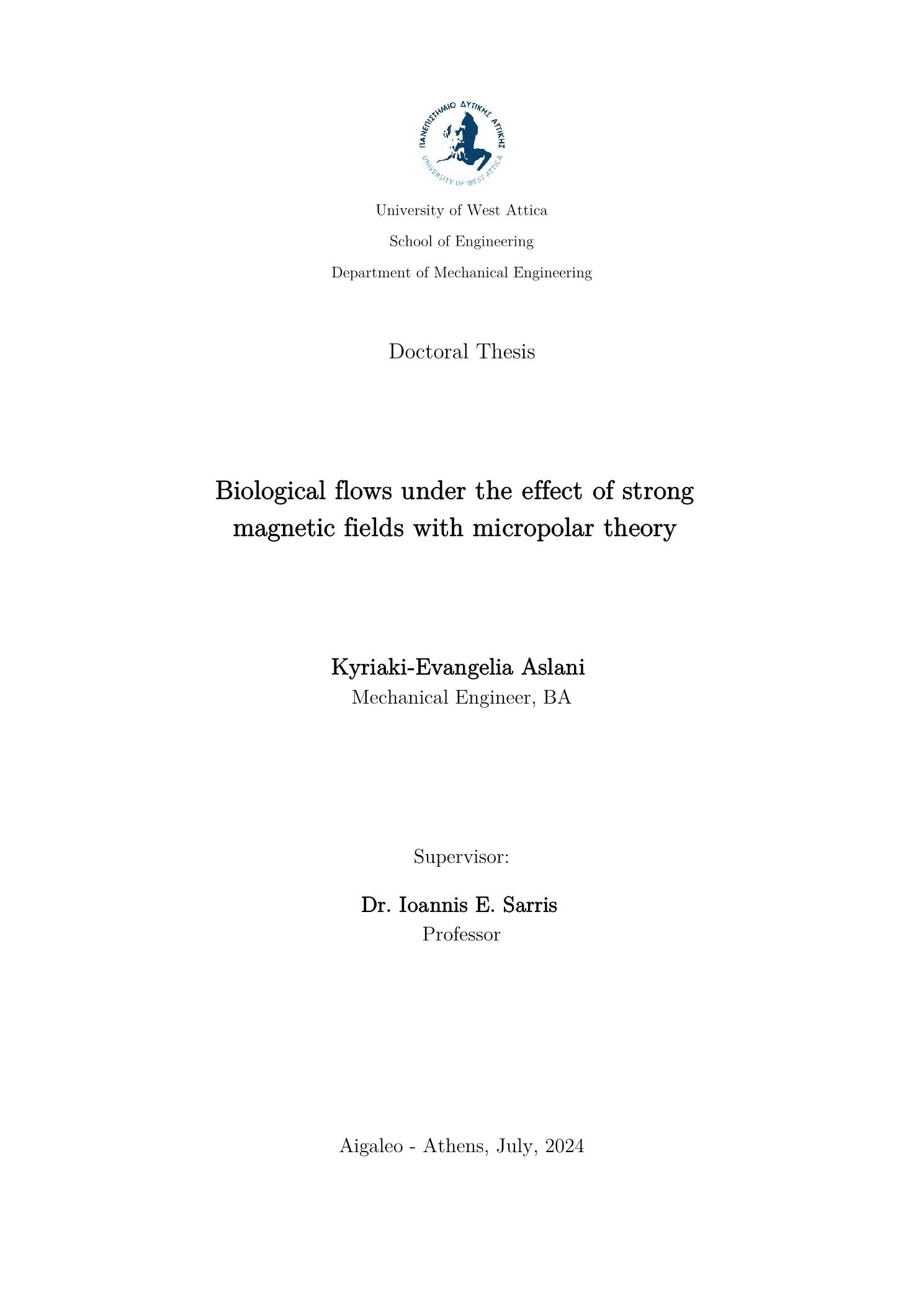 Η παρούσα διδακτορική διατριβή πραγματεύεται τη μελέτη ροών αίματος υπό την επίδραση ισχυρών μαγνητικών με χρήση της μικροπολικής θεωρίας. Η μικροπολική θεωρία αναπτύχθηκε από τον Eringen το 1966 και αποτελεί μία επέκταση του μοντέλου των εξισώσεων Navier-Stokes που εφαρμόζεται στη μελέτη των Νευτώνειων ρευστών. Η διαφορά της μικροπολικής θεωρίας σε σχέση με τις εξισώσεις Navier-Stokes έγκειται στην εισαγωγή ενός νέου διανυσματικού πεδίου (επιπλέον της γραμμικής ταχύτητας του ρευστού), της μικροπεριστροφής, η οποία αφορά τη συνολική γωνιακή ταχύτητα των σωματιδίων της εσωτερικής μικροδομής του ρευστού. Κατά αυτόν τον τρόπο, το αίμα θεωρείται μικροπολικό ρευστό, εξαιτίας της ύπαρξης των ερυθρών αιμοσφαιρίων στο πλάσμα. Επιπλέον, τα ερυθρά αιμοσφαίρια εμφανίζουν μαγνητική πόλωση, εξαιτίας των μαγνητικών ιδιοτήτων της αιμοσφαιρίνης που εμπεριέχεται στα πρώτα. Η μεταβολή της μαγνητικής πόλωσης συνεισφέρει στην αλλαγή της μικροπεριστροφής εξαιτίας της μαγνήτισης, που τείνει να ευθυγραμμιστε ...