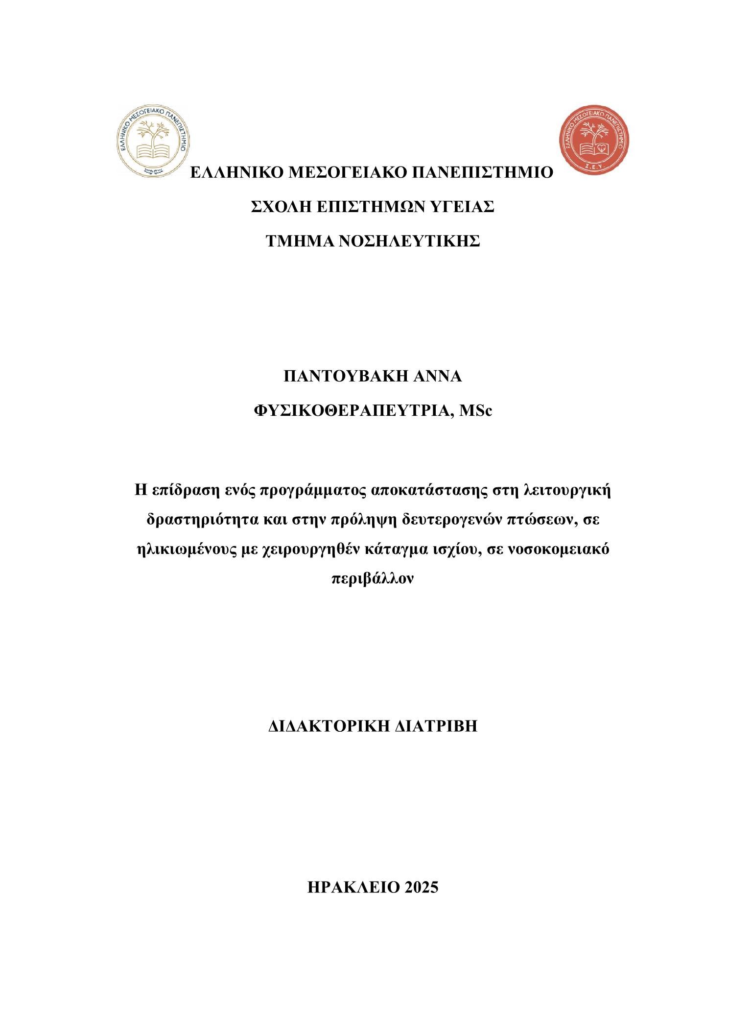 Οι πτώσεις σε άτομα ηλικίας άνω των 65 ετών αποτελούν τον πιο σημαντικό παράγοντα που οδηγεί σε σοβαρούς τραυματισμούς, σε αυξημένο ποσοστό θανάτων με σοβαρές κοινωνικοοικονομικές επιπτώσεις. Επιδημιολογικά διαπιστώνεται ότι το αυξημένο ποσοστό πτώσεων σχετίζεται με φυσιολογικές αλλαγές της γήρανσης και πλήθος άλλοων παραγόντων όπως και ένα ακατάλληλο εργονομικά περιβάλλον. Τα κατάγματα ισχίου είναι ο πιο συχνός τραυματισμός μετά από πτώση σε άτομα άνω των 65 ετών γεγονός που προκαλεί έκπτωση στη λειτουργική τους ικανότητα και ανεξαρτησία. Κρίνεται αναγκαία για την αντιμετώπιση του παραπάνω προβλήματος, η εφαρμογή ενός κατάλληλου προγράμματος αποκατάστασης βασισμένο στην άσκηση και εκπαίδευση του ασθενούς, που θα μειώνει τον κίνδυνο δευτερογενών πτώσεων και θα αυξάνει την αυτοπεποίθηση του στις καθημερινές του δραστηριότητες. Εισαγωγή: Τα κατάγματα μετά από πτώση, σε άτομα άνω των 65 ετών, είναι από τα σημαντικότερα προβλήματα που απασχολούν τους ερευνητές στο πεδίο της Γηριατρικής επιστήμης. Έχουν γίνει πολλές μελέτες σχετικά με τις ηλικιακές παθοφυσιολογικές αλλαγές, με τις πτώσεις και τα κατάγματα που τις συνοδεύουν όπως επίσης και για τα κατάλληλη θεραπευτική προσέγγιση και διαχείριση. Κοινό χαρακτηριστικό των ατόμων που καταλήγουν σε πτώση με κάταγμα ισχίου φαίνεται να είναι η μυϊκή ατροφία που παρατηρείται, ανεξάρτητα από την αιτιολογία της και η παρούσα παρέμβαση στοχεύει στην μείωσή της μέσα από την άσκηση ενδυνάμωσης και ισορροπίας που εφαρμόζεται στο πρόγραμμα της παρέμβασης. Σκοπός: Σκοπός της μελέτης ήταν να διερευνηθεί η επίδραση ενός εξειδικευμένου προγράμματος αποκατάστασης βασισμένο στο πρόγραμμα άσκησης OTAGO, στη βελτίωση της λειτουργικής δραστηριότητας και στην μείωση δευτερογενών πτώσεων σε άτομα τρίτης ηλικίας με χειρουργηθέν κάταγμα ισχίου. Μεθοδολογία: Στο περιβάλλον του νοσοκομείου και σε νοσηλευόμενους ασθενείς με χειρουργηθέν κάταγμα ισχίου από πτώση, έγινε αξιολόγηση και παραπομπή των ασθενών στο ιατρείο πρόληψης πτώσεων για τη συμμετοχή τους στο πρόγραμμα παρέμβασης. Οι ασθενείς αξιολογήθηκαν μετά το εξιτήριό τους στο ιατρείο πρόληψης πτώσεων στις 8 εβδομάδες μετά το χειρουργείο τους με τη χρήση ερωτηματολογίων αλλά και με αντικειμενικές μετρήσεις και στη συνέχεια διαχωρίστηκαν τυχαιοποιημένα σε δύο γκρουπ. Στο πρώτο γκρουπ (ή ελέγχου) υποβλήθηκαν τα ερωτηματολόγια, τα αντικειμενικά τεστ αξιολόγησης δύναμης και ισορροπίας καθώς και οι εργαστηριακές μετρήσεις στην πρώτη επίσκεψη (6-8 εβδομάδες μετά το χειρουργείο), στους 5 και 9 μήνες. Στους 12 μήνες έγινε τηλεφωνική συνέντευξη για την αξιολόγηση της λειτουργικής τους δραστηριότητάς τους. Οι ασθενείς που παρακολούθησαν το πρόγραμμα αποκατάστασης (γκρουπ παρέμβασης) αξιολογήθηκαν με τη χρήση ερωτηματολογίων, εξειδικευμένων τεστ αξιολόγησης και μέτρησης δύναμης και ισορροπίας πριν και μετά την ολοκλήρωση της παρέμβασης στους 6 και 9 μήνες επίσης. Στους 12 μήνες έγινε τηλεφωνική συνέντευξη για την αξιολόγηση της λειτουργικής τους δραστηριότητάς τους.Το πρόγραμμα αποκατάστασης περιελάμβανε πρόγραμμα άσκησης OTAGO (12 εβδομάδων από 2 συνεδρίες 45-60 λεπτών ,την εβδομάδα) καθώς έχει αποδειχθεί από διάφορες έρευνες η αποτελεσματικότητά του στην βελτίωση της δύναμης και της ισορροπίας των ασθενών στα άτομα τρίτης ηλικίας. Η παρέμβαση συ