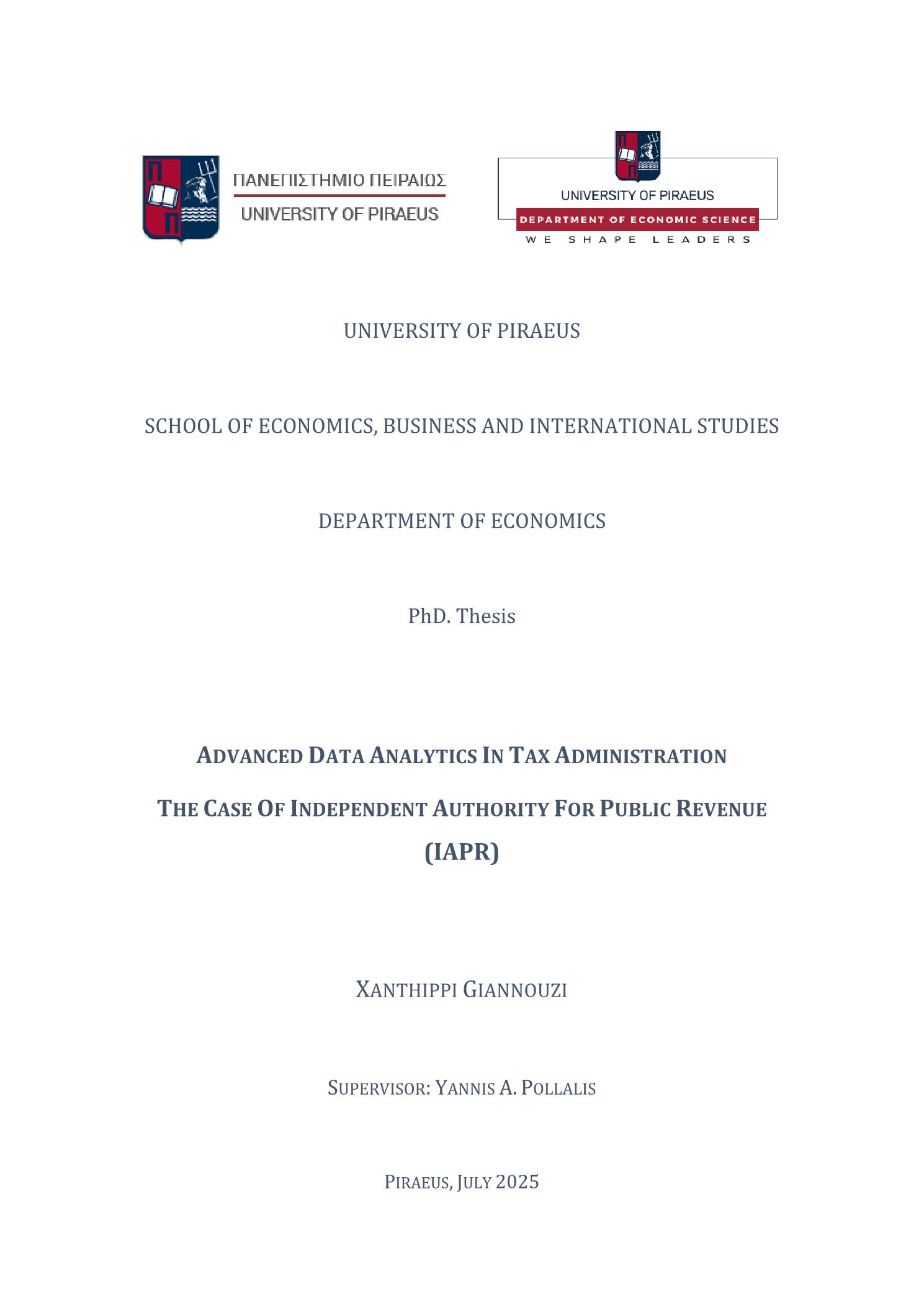 Tax administration has long been a key area of academic research, as governments seek to maximize revenue collection to implement their policies while minimizing the burden on taxpayers. Over time, however, the focus has shifted from a purely economic approach to a more complex perspective that integrates economics with sociology and psychology. The most recent and promising research development in this field is the use of advanced data analytics, combined with primary research among taxpayers. Such an approach can help identify areas of potential non-compliance and, in turn, improve the effectiveness of tax collection processes. This thesis investigates how advanced data analytics techniques can transform the functioning of tax administrations by improving the understanding of taxpayer compliance, enhancing strategic targeting, and aligning institutional practices with international standards—thereby strengthening compliance outcomes. The study focuses on the case of the Independent A ...